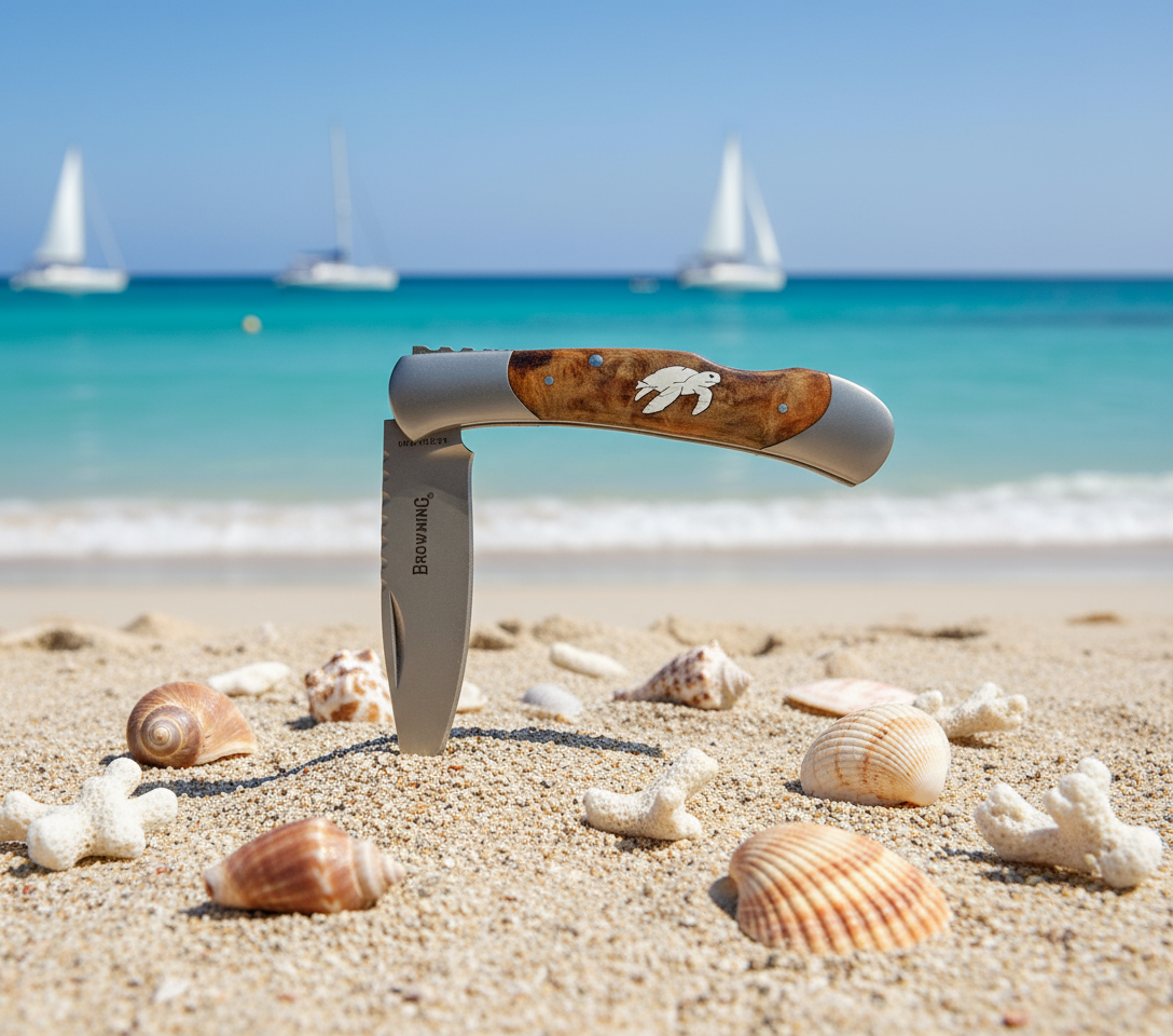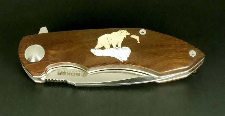 Boker Linerlock with brass bear catching copper salmon in a silver river.